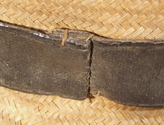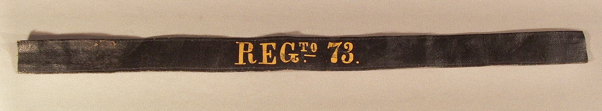 An enlisted Spanish soldier's straw hat of local Filipino manufacture. It is made of coarse woven straw with a high conical crown and a brim bound in white linen, now age toned to an oatmeal color. Of special interest is the rare oilcloth hat band with the unit designation "REGto. 73" painted in yellow. The painted letters are worn but clearly visible. A separate and unworn hat band shows what it would have looked like when new. These two items are from the collection of the Minnesota Military Museum at Camp Ripley and are just a few of many souvenirs brought home by Pvt. William G. Compton, Co. C, 13th. Minnesota Volunteer Infantry. Artifacts courtesy Minnesota Military Museum