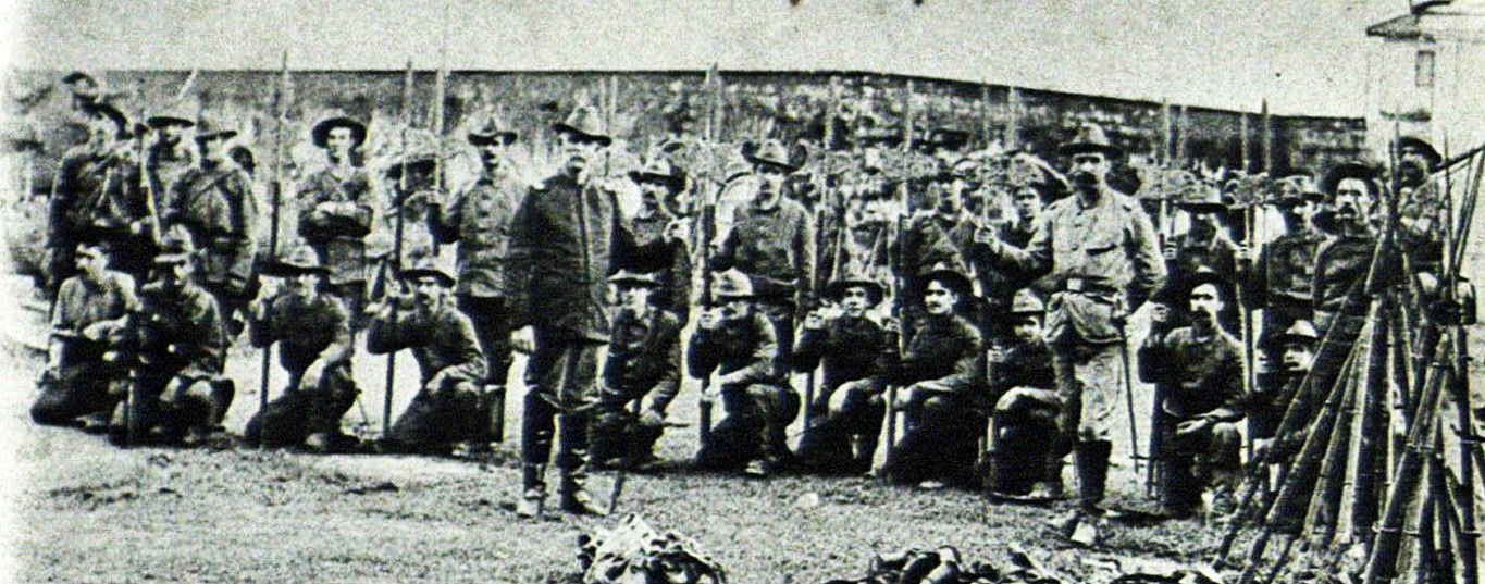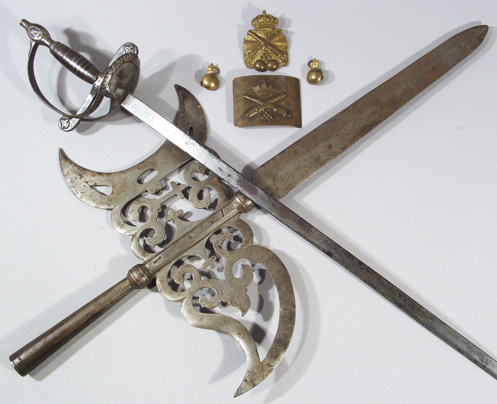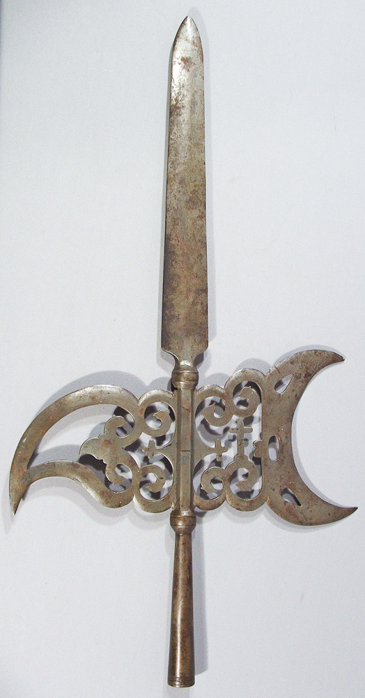An halberd head of the particular pattern used by the Alabarderos in the Philippines. The specimen is one of two that were found in Arkansas. No other information as to provenance is known. When this pattern was adopted is not known. However, images dating between 1885 and 1898 all show this same pattern and all examples in the souvenir record are indentical. The halberd was of a distinctive design used only by this corps. The head measures 69.5 x 37 cm. The spear is double edged, the ax blade is crescent shaped on the edge and is inserted into the shaft and held with three screws. Both the blade and hook are pierced highlighting Christian cross and bird's head motifs. The socket has several decorative lines around the base. This would have been mounted on a wooden shaft with an iron base. None of the halberds examined have been maker marked and some question remains as to whether they were forged in Spain or the Philippines. A fair number of these halberds, either complete or just the head, have survived in the souvenir record. At least five are known to exist in private collections in the US, including mine shown here, the Smithsonian holds at least two, one, the souvenir of Col. Webb C. Hayes is at the Rutherford B. Hayes Presidential Museum and another is kept at the Ft. Ligonier Museum although misidentified as 18th century. Without question, there could be others of which I am not aware in the US, Spain and the Philippines. There number suggests, as does the photograph below of American soldiers holding a sizable number of captured halberds, that more of these weapons were housed at the Manila government palace armory than were needed by only 25 guards. I suspect, although it is purely speculation, that there were once no fewer than 50 but not more than 100 halberd and sword sets made. We may never know the exact numbers. Men of the regular army's 12th US Infantry pose in the Philippines with captured Spanish weapons and equipment, including about twenty halberds. While the image is not of the best quality, the pattern of the halberd heads can still be easily distinguished. The swords carried by the Alabarderos were equally unique. Designed to resemble the rapiers of the 17th century, they were a close copy of the Model 1848 Real Cuerpo de Guardias Alabarderos sword. They differ in several details from the royal guards' swords including the long cut-a-way portion of the cup guard, an elongated flat sided pommel, a noticeably smoother grip and the inscription on the blade eliminates the word "Real" or royal. The straight, single edged blade is 80.5 cm in length and made without a fuller. The obverse is marked "FÁBRICA DE TOLEDO 1863, the reverse engraved in script "Cuerpó de Guardias Alabarderos." The iron hilt has a two branch cup guard embossed with the royal arms of Spain and edged in a border of fleur-de-lys and chevrons. Fleur-de-lys are also embossed on the crossguard finials and ferrule. The pommel has a castle on the obverse and rampant lion on the reverse. The scabbard was made of black leather with iron mountings. The throat has a frog stud embossed with a mythical face and the bottom edge is engraved with a chevron and fleur-de-lys border. The drag has a matching border button finial on the tip.