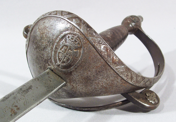 Three views of the sword's hilt showing the royal crest and the open portion of the cup guard.