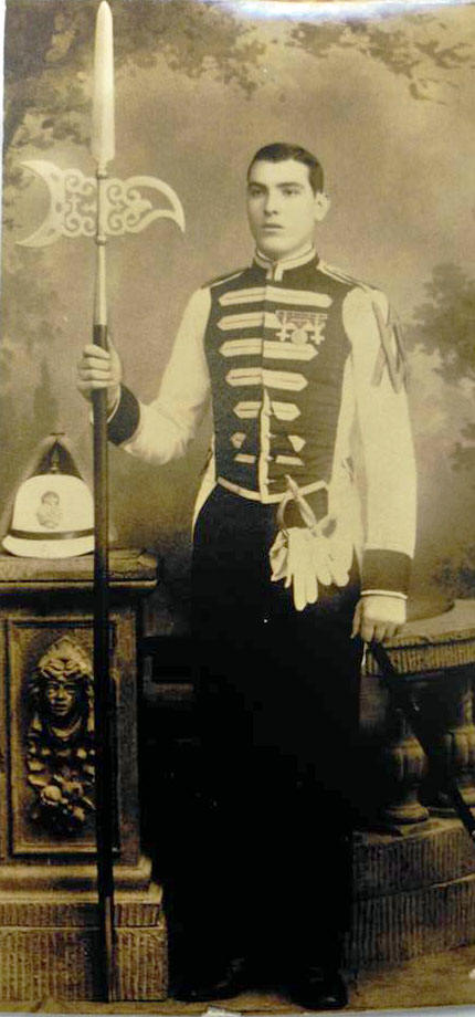 An Alabadero wearing the gala dress uniform with white tailcoat with red facings and red vest. The color of the braid trim has not been documented. Photo courtesy of Luis Sorando